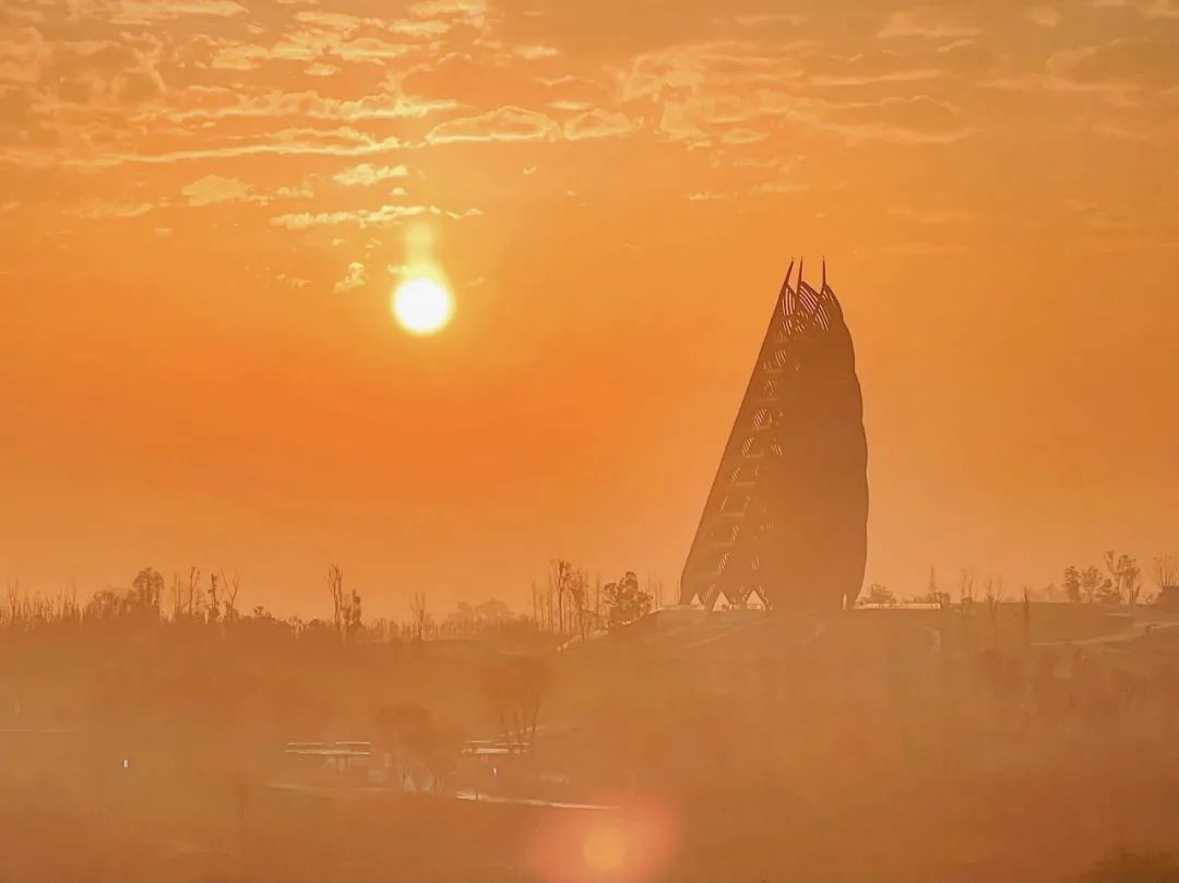 成都大熊猫繁育研究基地竹笋造型的观光瞭望塔沐浴在新年初升的日光里。新华网 罗帅 摄