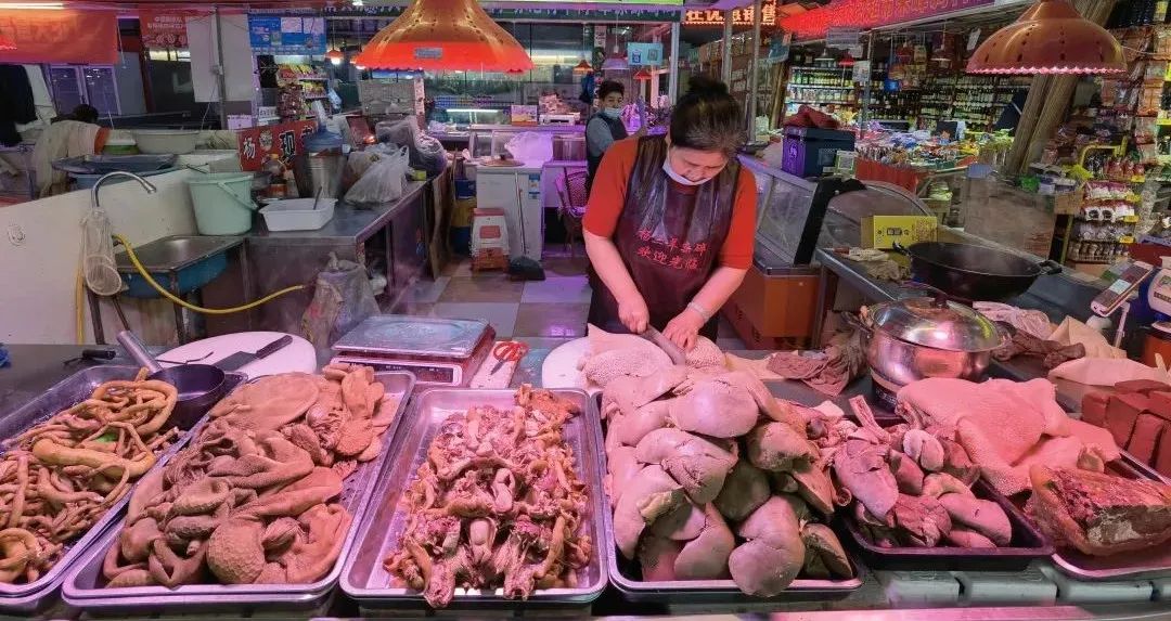 1月1日,内蒙古自治区包头市青山区屹林生态农贸市场,商贩正在切割羊杂,等待售卖。新华网 杨腾格尔 摄