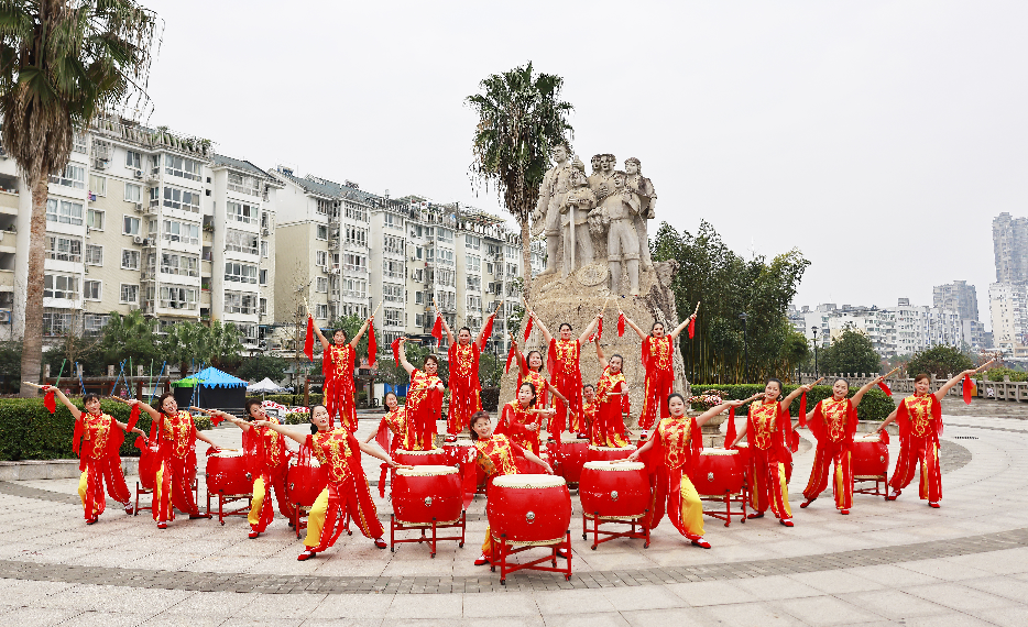 2022年1月1日一早,在福建省南平市顺昌县,市民身着彩装,在广场敲大鼓迎接新年的到来。新华网发 徐华山 摄