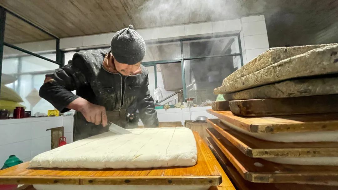 2022年1月1日,安徽省铜陵市郊区千年古镇大通的一家传统手工豆腐作坊内,师傅在忙着制作豆腐。陈磊 摄