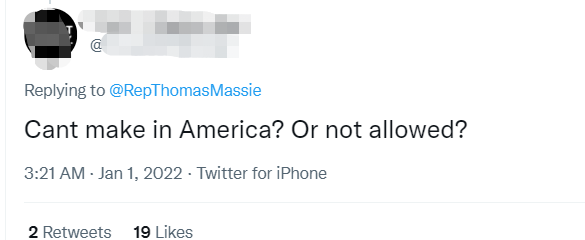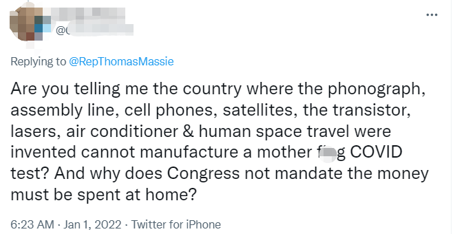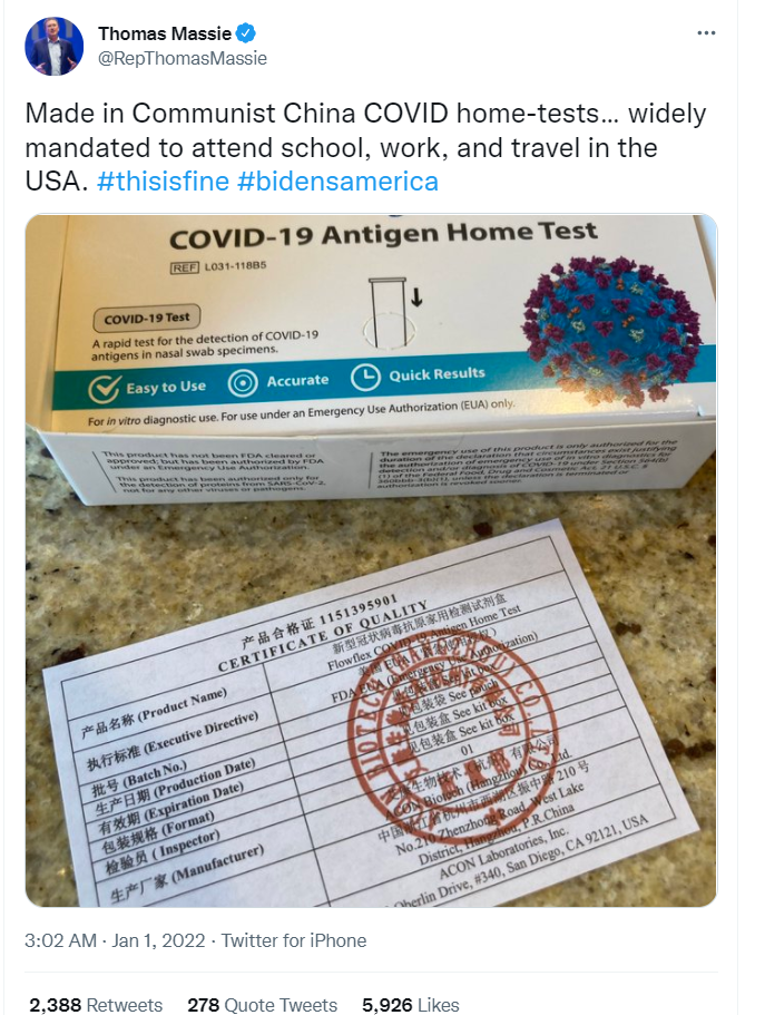 (观察者网讯)当地时间2021年12月31日(北京时间2022年1月1日凌晨3时),前不久因为全家持枪迎圣诞的照片“火”了一把的美国众议员托马斯·马西(Thomas Massie),在推特展示了中国制造的新冠病毒家用检测试剂盒,还给了产品中文合格证一张特写,强调中国产的试剂盒已在美国被广泛授权使用,“this is fine”(行吧)。