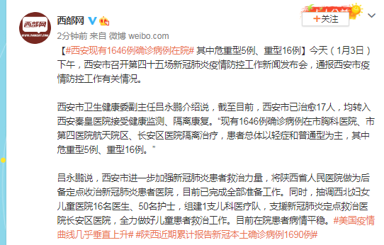 原标题:西安现有1646例确诊病例在院 其中危重型5例、重型16例