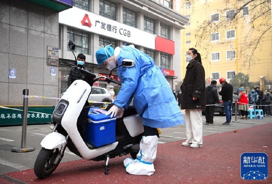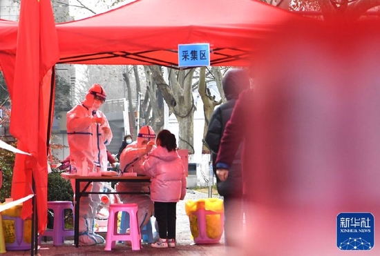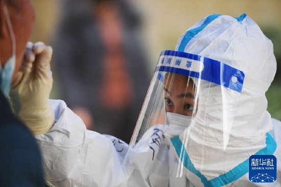 1月10日,在郑州市二七区政通路一处核酸检测点,医务人员为市民进行核酸检测取样。
