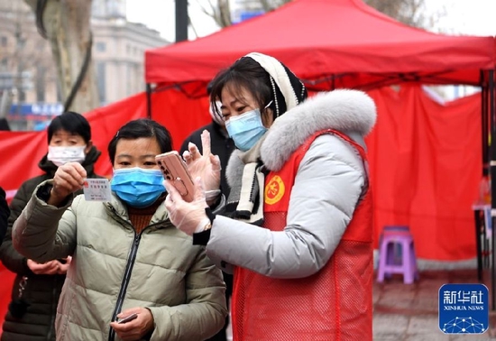 1月8日,在郑州市金水区花园路街道办事处一社区核酸检测点,志愿者在协助市民扫码登记。