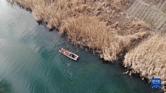 2021年12月16日 ,水上保洁员在白洋淀打捞水上杂物(无人机照片)。新华社记者 骆学峰 摄
