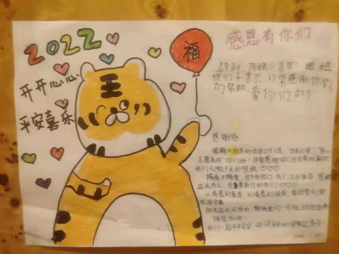 在这些简单稚嫩的画作里,画中笔笔皆真情。有的小朋友用自己的画笔记录着工作人员每天来来回回的工作,有的小朋友用小老虎来寄托对新的一年的美好期待。孩子们用自己的方式,表达着对工作人员悉心照料的感谢。