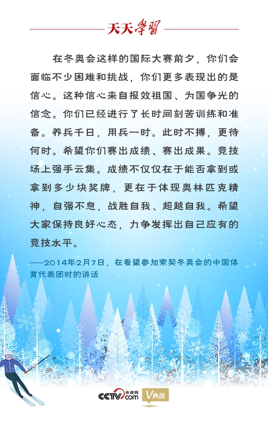 习近平总书记先后五次实地考察冬奥会筹办工作,强调要通过筹办北京冬奥会、冬残奥会,推动我国冰雪运动跨越式发展,补缺项、强弱项,推动新时代体育事业高质量发展。总书记多次引经据典勉励运动员、教练员、工作人员和志愿者等,《天天学习》特撷取其中经典语句,与您一起学习领悟。
