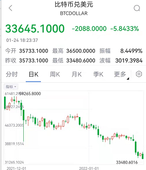 比特币与暴跌的美国科技股出现联动 周日跌破3万5千美元大关