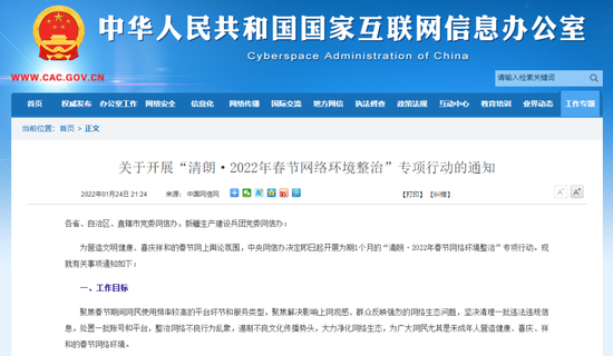 为营造文明健康、喜庆祥和的春节网上舆论氛围,中央网信办决定即日起开展为期1个月的“清朗·2022年春节网络环境整治”专项行动。现就有关事项通知如下: