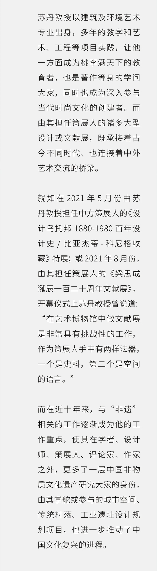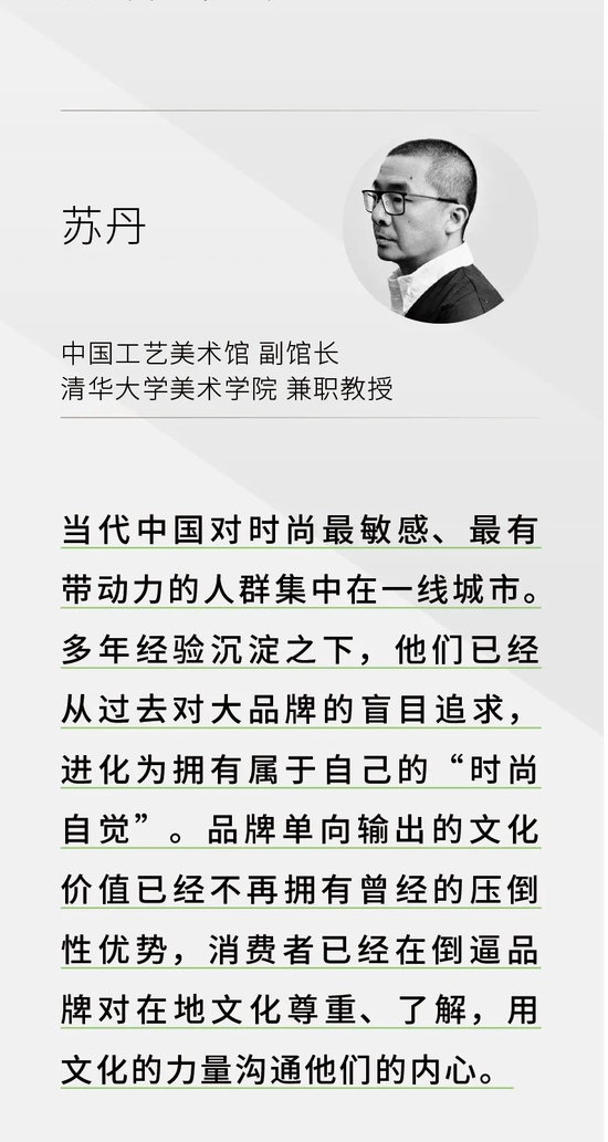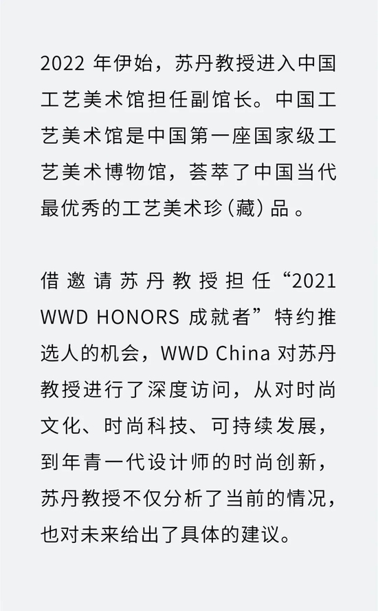 这不仅只是宏观的发展,更是企业本身树立自身品牌文化的课题。告别简单的符号援引,在文化解读和文化创新中实现产业变革与发展,是大势所趋,也是今日无论国际或者中国品牌企业在中国市场永续发展之必要。也因此,WWD HONORS CHINA, 将文化纳入了企业成就的重要维度,也特别邀请到中国工艺美术馆副馆长、清华大学美术学院前任副院长、博士生导师、“非遗”研究家苏丹教授,担任首届 WWD HONORS CHINA 的推荐评审。