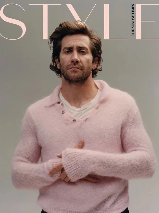 《The Sunday Times》大片,演员 Jake Gyllenhaal 身穿粉色 Prada 马海毛衫亮相封面,在内页图中同样以白色粗针织马海毛衣作为内搭,泛着微光的绒毛质地为他增添了一丝柔和气息。