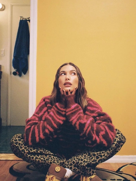 Hailey Bieber 就曾在 Instagram 上传一组为 Drew house 所拍摄的照片,一身粉色条纹马海毛衫搭配豹纹裤子,为沉闷冬日注入活力。