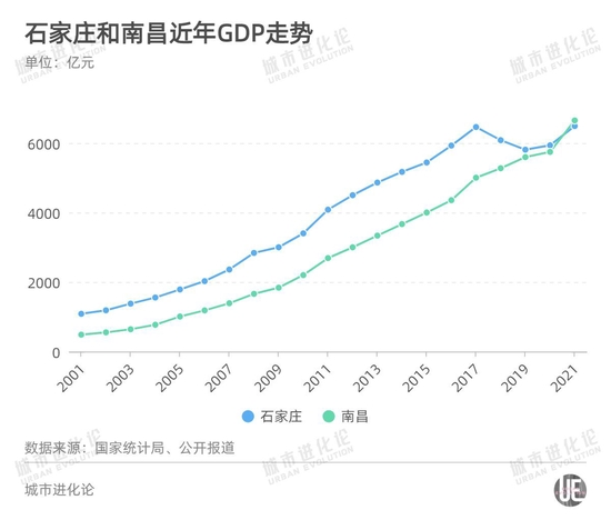 1月23日,石家庄政府工作报告透露,预计去年地区生产总值达到6490亿元、增长6.6%,远低于8.1%的全国平均增速。由此计算,南昌2021年GDP已反超石家庄160亿元左右。