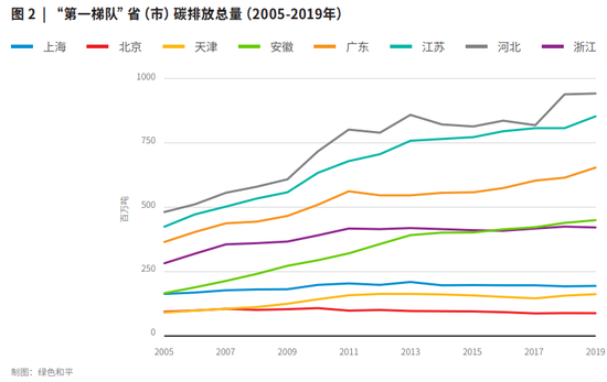 2021年10月,国务院发布《2030年前碳达峰行动方案》,提出“京津冀、长三角、粤港澳大湾区等区域要发挥高质量发展动力源和增长极作用,率先推动经济社会发展全面绿色转型”。因此,报告将京津冀江浙沪皖粤八个重点省(市)作为中国实现低碳绿色转型目标的“第一梯队”。