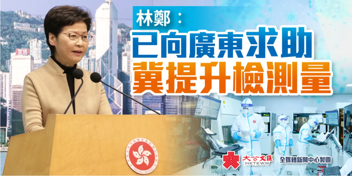 林郑月娥表示,她已经向广东省求助,希望可以分担部分检测容量至香港,提升检测能力。她表示,过往内地对香港有许多帮助,包括协助全民检测、紧急提供多张病床等。