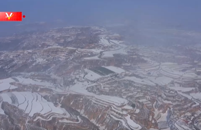 △雪后的黄土高原,梯田纹理清晰可见,如画一般。(总台记者康晓宇、朱锐峰拍摄)