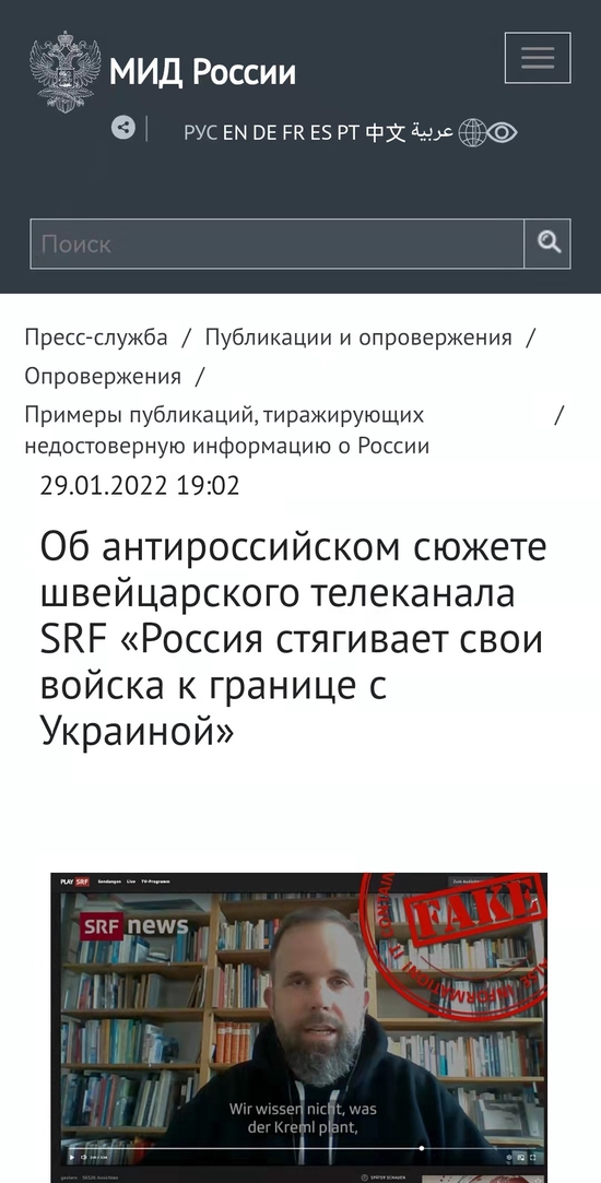 当地时间1月29日,俄罗斯外交部发表声明,对瑞士德语广播电视台(SRF)播出的题为“俄罗斯将军队派往俄乌边界”的新闻进行驳斥。
