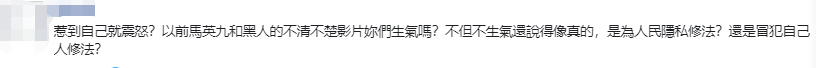 “惹到自己就震怒?”还有网友提到,“以前马英九和黑人的不清不楚影片你们生气吗?不但不生气还说得像真的,是为人民隐私修法?还是冒犯自己人修法?”有网友留言道。