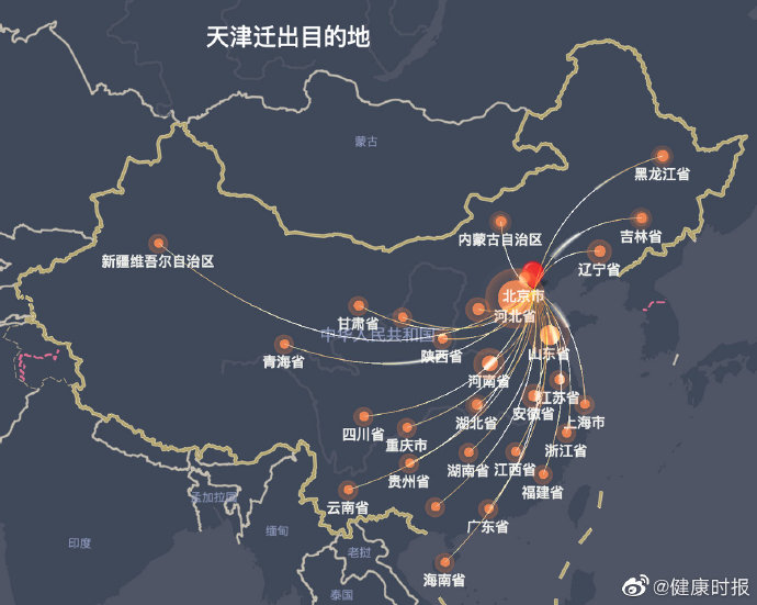 健康时报记者通过百度迁徙大数据发现,天津的迁出目的地中,河北省、山东省、河南省位列前三,从城市来看,沧州市、德州市、唐山市为前三的迁出目的地。