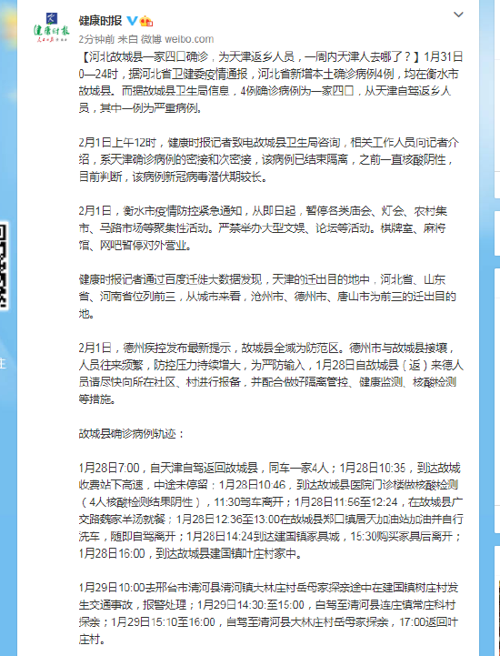1月31日0—24时,据河北省卫健委疫情通报,河北省新增本土确诊病例4例,均在衡水市故城县。而据故城县卫生局信息,4例确诊病例为一家四口,从天津自驾返乡人员,其中一例为严重病例。