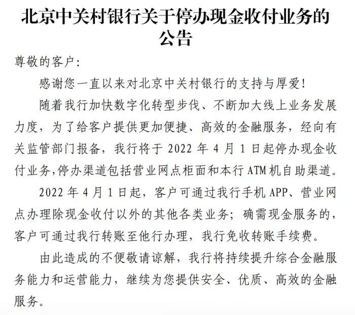 1月28日,中关村银行发布公告称,随着该行加快数字化转型步伐、不断加大线上业务发展力度,为了给客户提供更加便捷、高效的金融服务,经向有关监管部门报备,该行将于2022年4月1日起停办现金收付业务,停办渠道包括营业网点柜面和ATM机自助渠道。