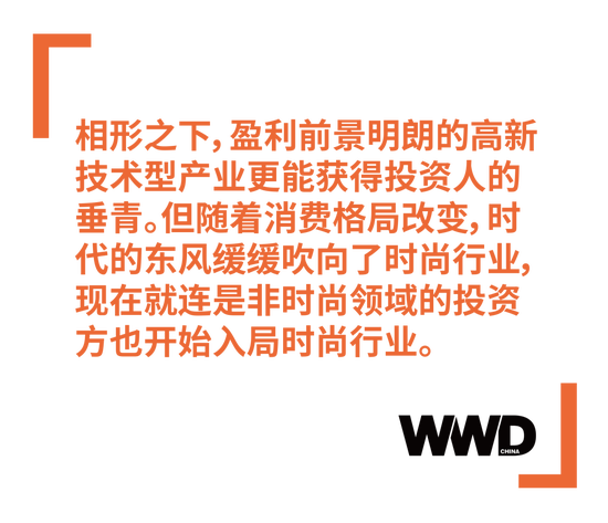 有分析指出,服饰行业之所以长期不被资本青睐,主要是因为服饰在本质上属于传统行业,技术含量偏低,而且市场也相对稳定。相形之下,盈利前景明朗的高新技术型产业更能获得投资人的垂青。但随着消费格局改变,时代的东风缓缓吹向了时尚行业,现在就连是非时尚领域的投资方也开始入局时尚行业。