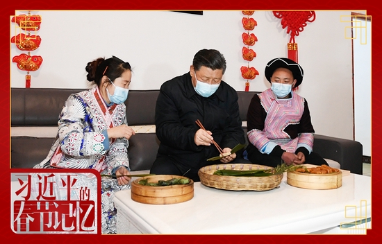 2021年2月3日,习近平总书记在贵州省毕节市黔西县新仁苗族乡化屋村苗族村民赵玉学家,同赵玉学一家边聊家常边制作当地传统节日食品黄粑。