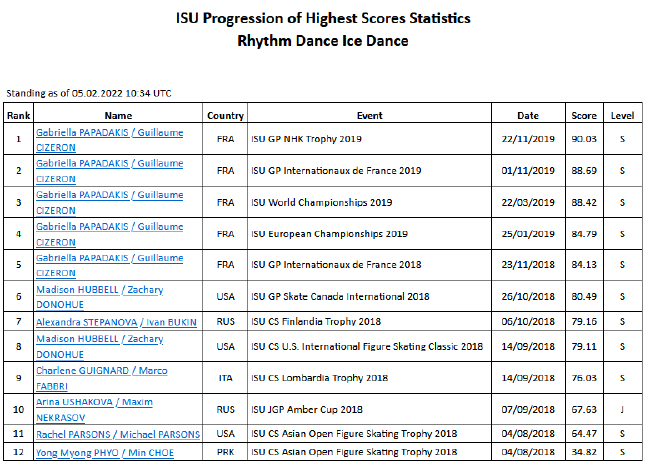 北京时间2月12日晚,2022北京冬奥会花样滑冰冰上舞蹈韵律舞比赛在首都体育馆战罢。第3组第3个出场的中国组合王诗玥/柳鑫宇,倾情演绎了“猫王”的经典曲目,得到73.41分,排名第12位晋级自由滑;平昌冬奥会银牌得主、法国组合帕帕达基斯/西泽龙,以90.83分连续第6次刷新冰舞韵律舞历史最高分,排名第一;俄罗斯奥运队组合西尼齐娜/卡察拉波夫和美国组合哈贝尔/多诺霍分列第二和第三位。