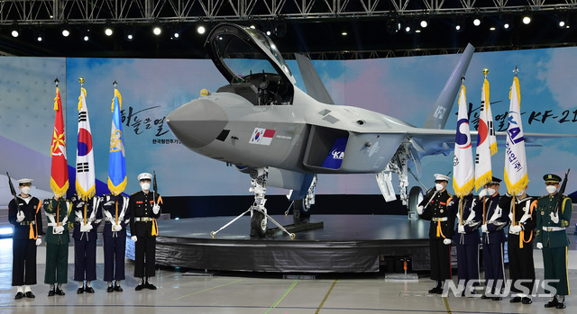 下线仪式上的首架KF-21战机原型机,机头侧面涂有韩国与印尼两国国旗 图:朝鲜日报