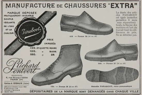1910 年,Lzeaux 镇一家鞋厂的工人裁缝 Rémy-Alexis Richard 遇到了他的结婚对象 Juliette Pontvert,女方的嫁妆成为了 Richard-Pontvert 公司的创立的资本,这也是为何如今 Paraboot 鞋底印有 RP 字样的原因。