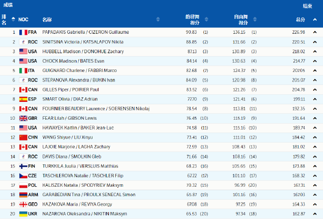 北京时间2月14日中午,2022北京冬奥会花样滑冰冰上舞蹈自由舞比赛在首都体育馆战罢。第2组第4个出场的中国组合王诗玥/柳鑫宇,很好地将中国元素融入《功夫钢琴》之中,最终自由舞得到111.01分,总分184.42分,获得第12名,创造了中国冰舞的冬奥历史最佳战绩;平昌冬奥会银牌得主、法国组合帕帕达基斯/西泽龙,以总分226.98分连续第6次刷新冰舞总分历史最高分,获得金牌;俄罗斯奥运队组合西尼齐娜/卡察拉波夫和美国组合哈贝尔/多诺霍分获银牌和铜牌。