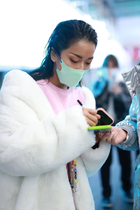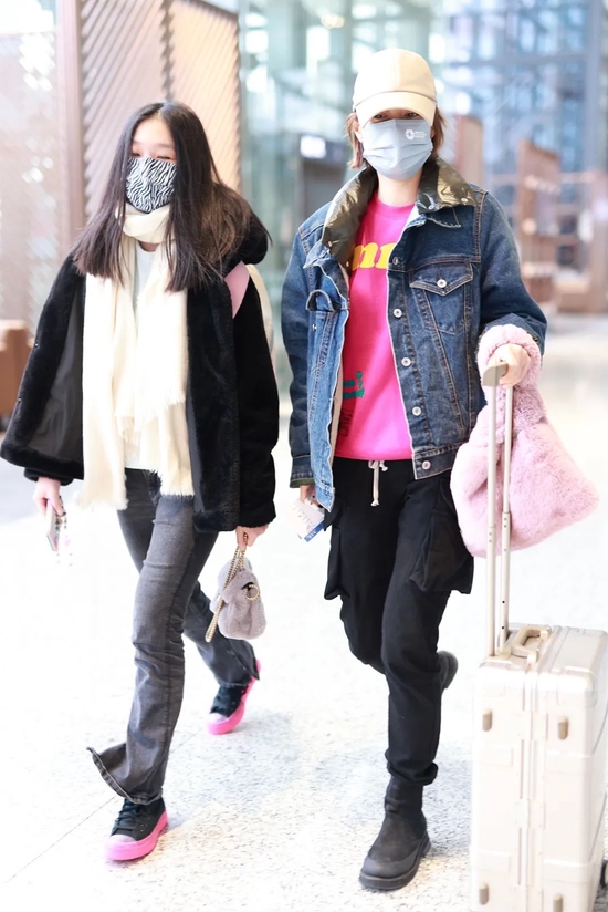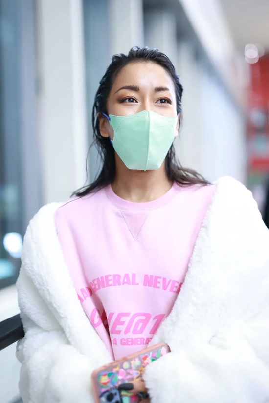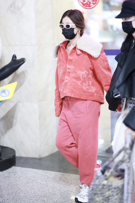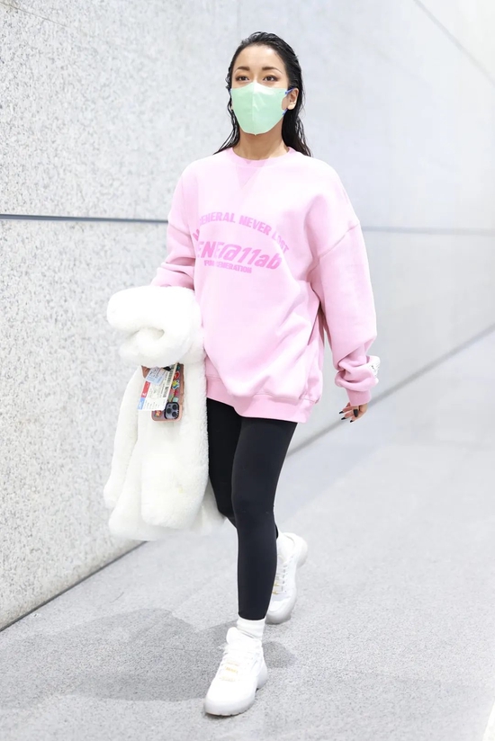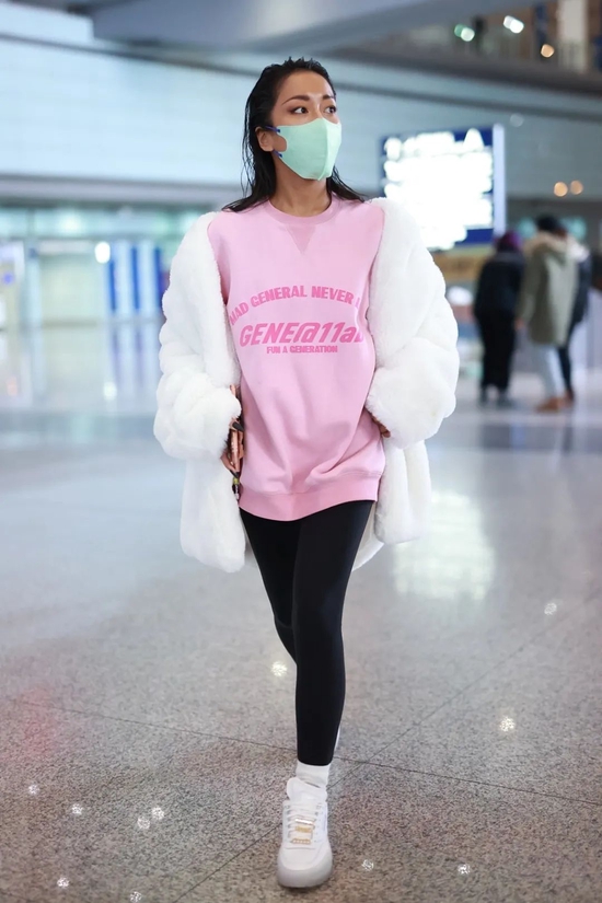 白色毛绒大衣搭配嫩粉色卫衣和Legging,这样搭飞机是真的舒服,上宽下窄的法则也拿捏了。