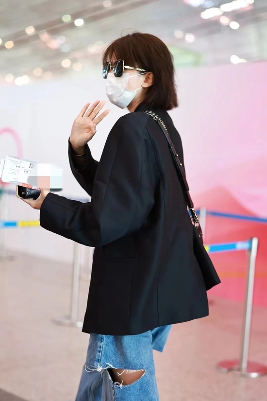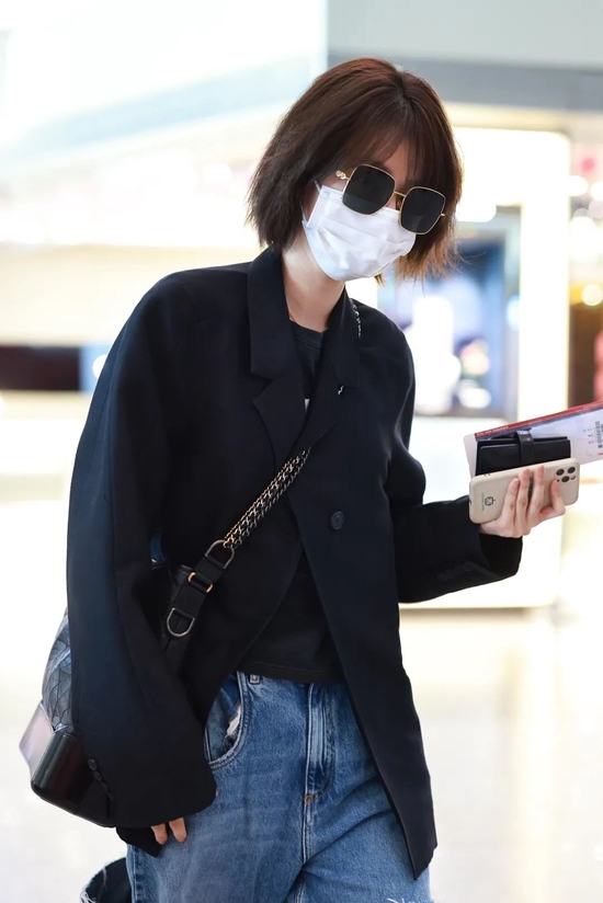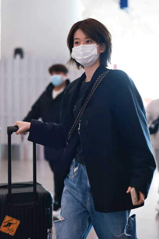 剪了短发的乔欣还蛮帅气,黑西装配T恤,下身是“割裂牛仔裤”和洞洞鞋,这两样单品没一个“善茬儿”。但是,她都驾驭住了诶!