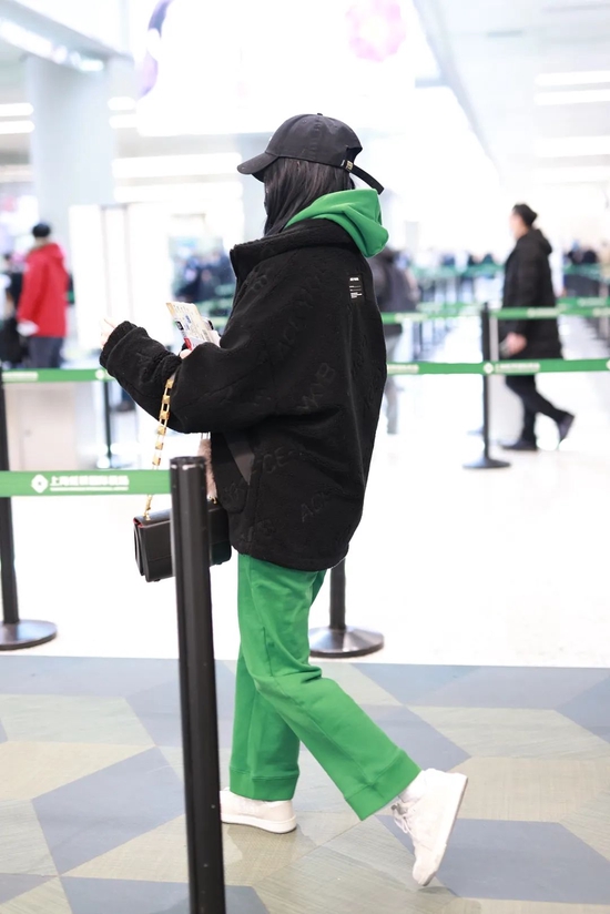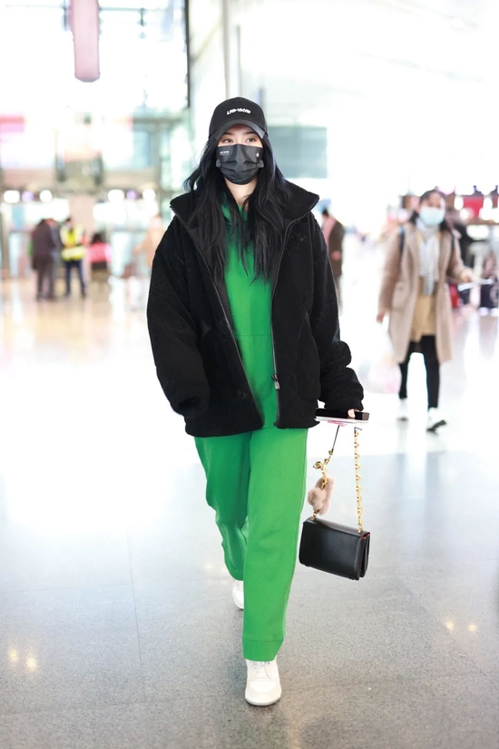徐艺洋用黑色摇粒绒外套搭配BV绿运动套装现身,Valentino手袋上夹着毛茸茸的粉色发抓,时髦辣妹认证!