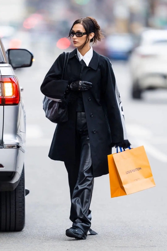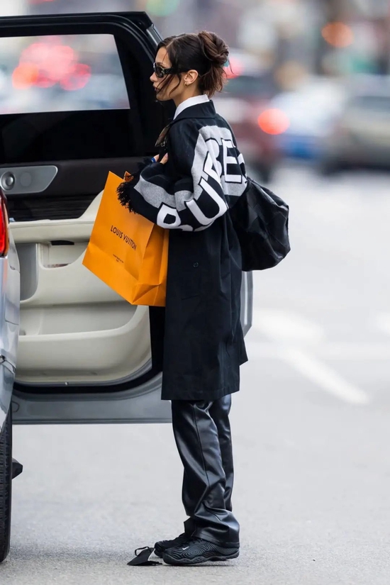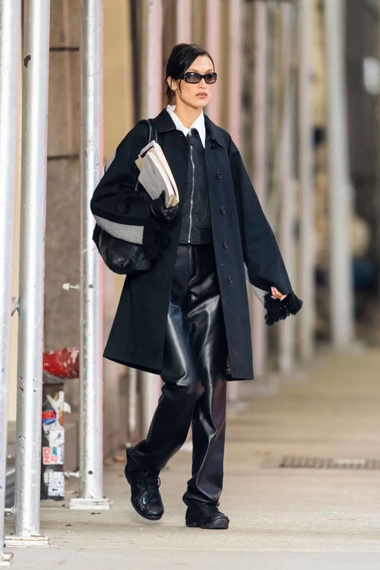 自己做Stylist的贝贝也是终于认真打扮了,黑色风衣里面穿一件白衬衫,露出尖领增加层次感。皮裤挺括有型,这身我可以,All Black造型也不无聊~