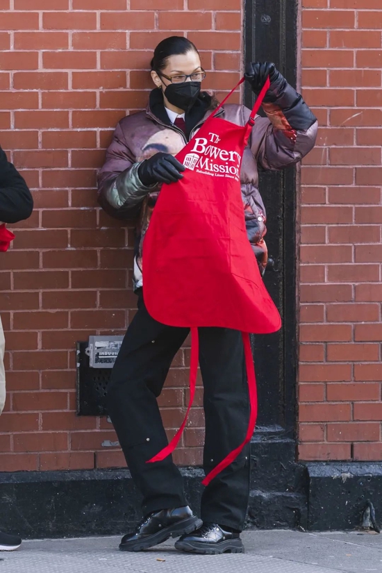 人美心善的贝贝在纽约的庇护所参加慈善活动,为无家可归的人们准备食物。围上红围裙的样子好接地气。以及,这框架眼镜像极了我在家里戴的那副哦!