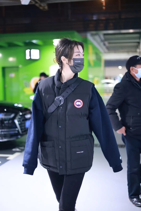 单手拎起那么大的袋子,小棠好霸气~羽绒背心搭配深蓝色卫衣倒是很Old School的穿法,是一种,很古早帅气。