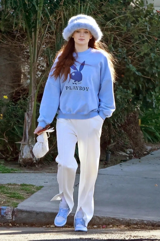 菲菲与二乔现身洛杉矶,天蓝色皮草帽敲可爱,仿佛一坨软绵绵的☁️飘在头顶。搭配印花卫衣和白色开衩裤,梦幻了,蓝白配太奶啦!