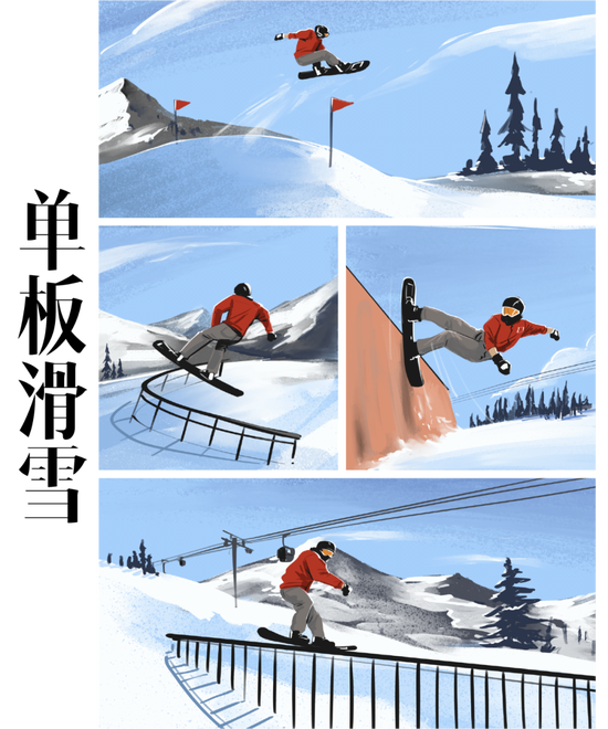 • 如果你喜欢刺激紧张的比赛,千万不要错过空中技巧比赛。空中技巧运动员比赛时,是没有雪杖的,仅靠身体控制双板飞速冲下雪道,腾空并完成整套动作,如同飞翔。这是勇敢者的游戏。