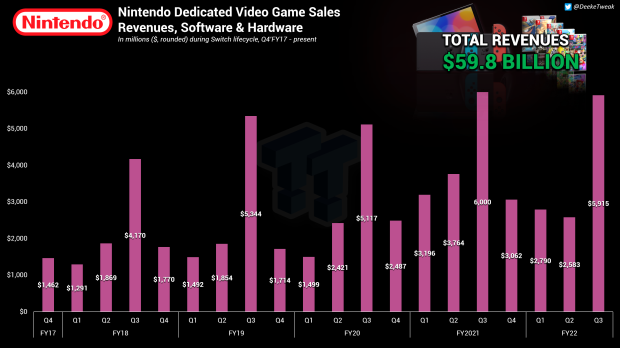 外媒统计了一下任天堂的财报,自 2017 年第四季度发布 Switch 以来,其游戏业务部门的累计总销售收入约为 598 亿美元。值得一提的是,任天堂从硬件上赚到的钱比从软件上赚到的还多,而且每台 Switch 都能盈利(索尼财报显示 PS5 卖一台亏一台)。