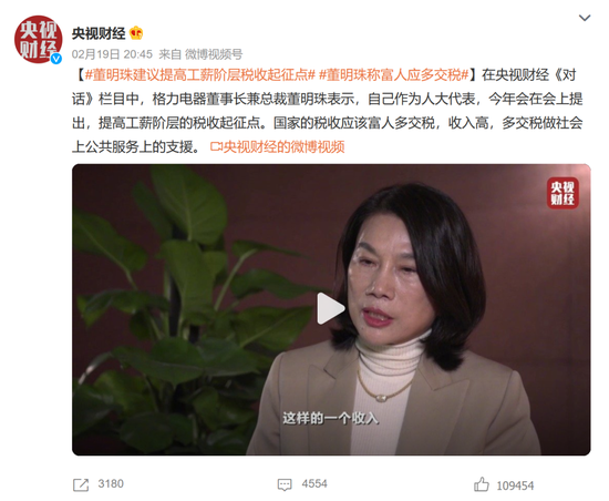 2月20日,据央视财经视频报道,在央视财经《对话》栏目中,格力电器董事长兼总裁董明珠表示,自己作为人大代表,今年会在会上提出,提高工薪阶层的税收起征点。国家的税收应该富人多交税,收入高,多交税做社会上公共服务上的支援。