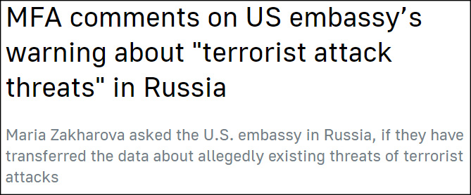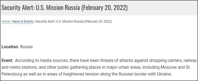 美国使馆在这份简短的声明中写道:“据媒体消息,在莫斯科、圣彼得堡及俄乌边境紧张地区的主要城区,购物中心、铁路、地铁站及其他公共集会场所面临袭击威胁。”