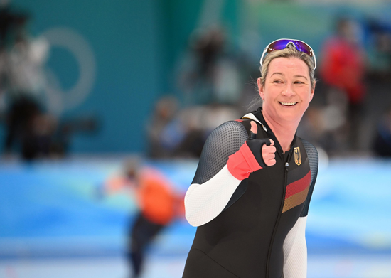 冲过速度滑冰女子3000米终点线时克劳迪娅·佩希施泰因高举双臂迎接属于自己的“第一”49岁的她是历史上年纪最大的女子冬奥选手这是她的第八次奥运会