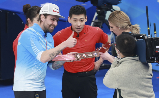 冰壶混双比赛后中国选手凌智和范苏圆向对方赠送“冰墩墩”奥运纪念徽章美国选手惊喜地接过礼物四人合影留念中国组合随后也收到了美国队回赠的徽章