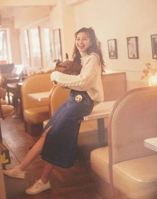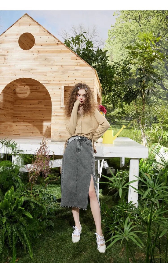 ????推荐理由:又是一条牛仔裙哦,毕竟经典,女孩子常备!这件有毛边的小设计,更柔和甜美,高开叉也增加了时髦度,搭配帆布鞋绝了!