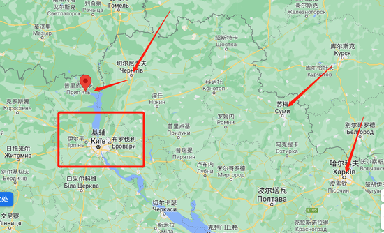在更具有战略意义的首都基辅附近,开战后俄军第一时间从俄白乌三国交界的森基夫卡地区进攻,此处距离乌克兰首都基辅的距离只有约200公里。这里也是俄军重兵集结之地,包括四十一军的完整建制全部部署在该地区。根据昨夜今晨的报道,包括切尔诺贝利核电站(标注处)已经在俄军的控制范围内,不论俄罗斯是否会进攻基辅,乌克兰首都早已持续处于俄军的威慑范围内。