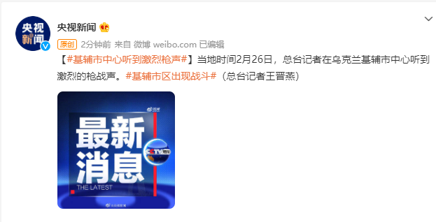 当地时间2月26日,总台记者在乌克兰基辅市中心听到激烈的枪战声。(央视新闻)
