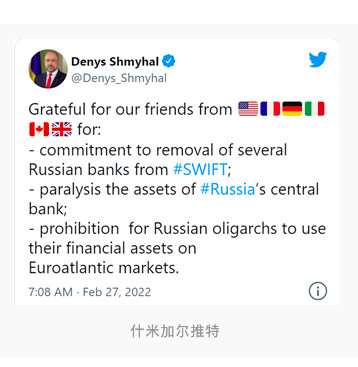 什米加尔在推特上表示,“感谢我们的朋友”美国、法国、德国、意大利、加拿大和英国对俄实施的最新一轮金融制裁。