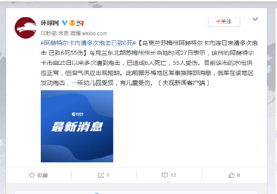 乌克兰东北部苏梅州州长当地时间27日表示,该州的阿赫特尔卡市自25日以来多次遭到炮击,已造成6人死亡,55人受伤。目前该市的水电供应正常,但油气供应出现短缺。此前据苏梅地区军事指挥部消息,俄军在该地区发动炮击,一所幼儿园受损,有儿童受伤。(央视新闻客户端)