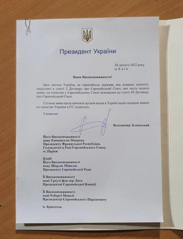 据央视新闻消息,当地时间2月28日,乌克兰总统泽连斯基签署加入欧盟的正式申请文件。